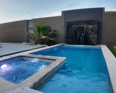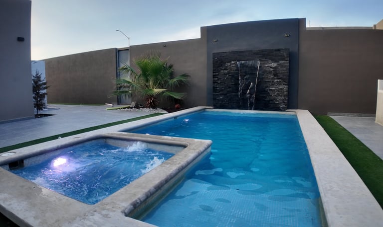 Cuenta con medidas de 4x8 en el área de patio, cuenta con una parte de jacuzzi blower para relajación, sin lugar a duda se convertirá en una de las áreas perfectas para poder recibir invitados, o simplemente disfrutar un momento de relajación, el sonido de la cascada da la tranquilidad para poder realizar actividades al aire libre.